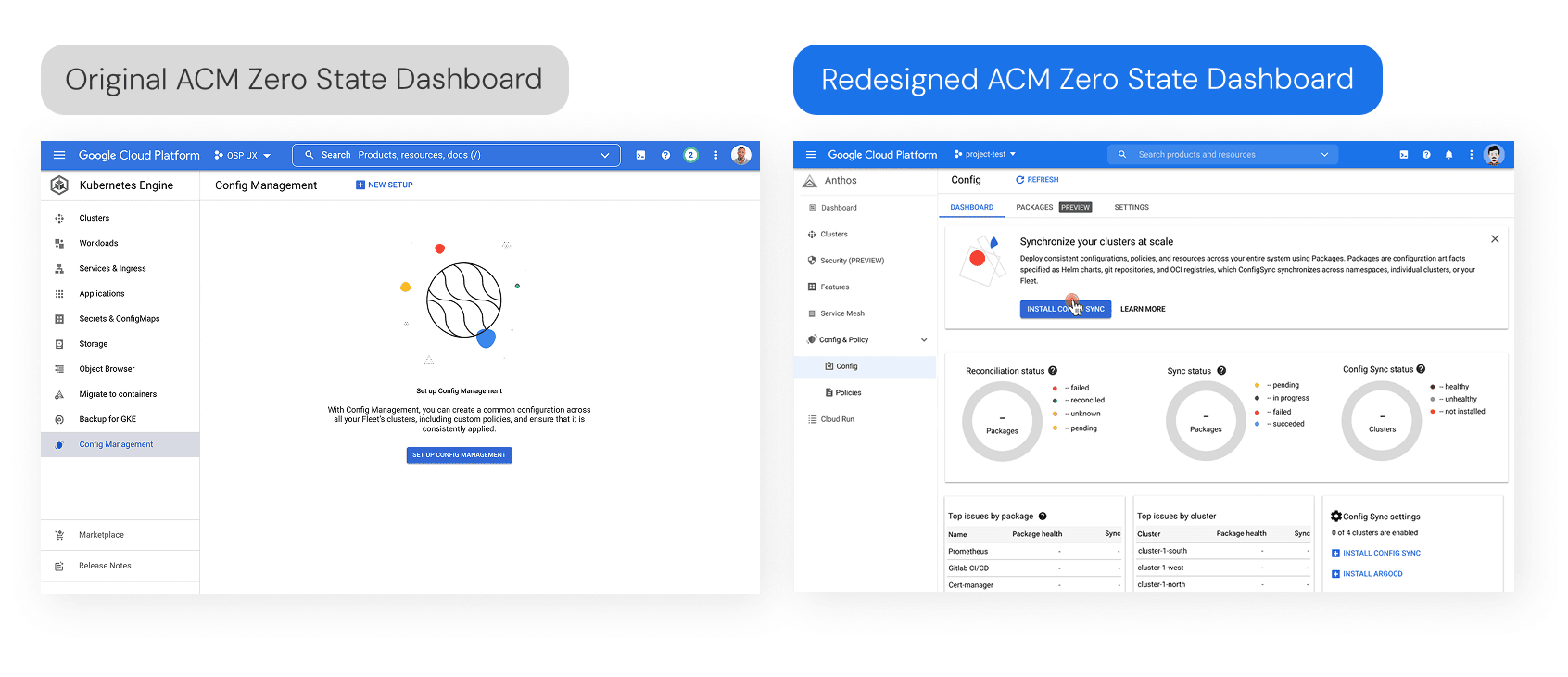 Rethinking the zero state. Another GKE team had researched what drives conversion from zero-state dashboards. The clear winner: showing users what the product looks like when it's working, before they install anything. I applied that pattern to both Config Sync and Policy Controller. The new flow became: value-first dashboard, install, observe. Simple and linear.