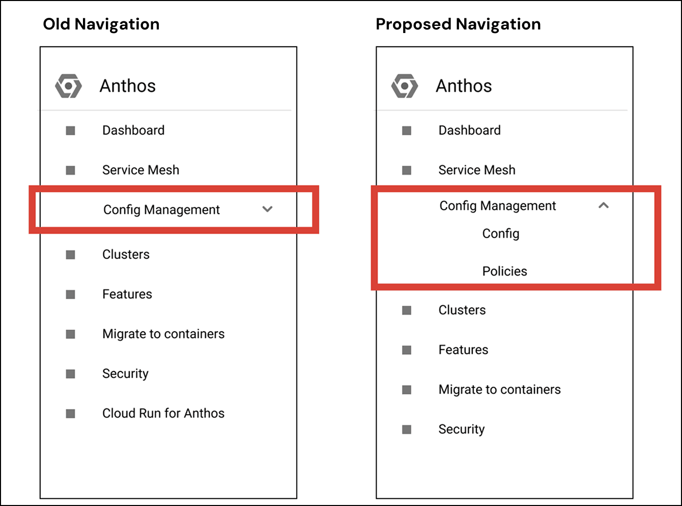 Separating the two tools. I proposed restructuring the IA to give Config Sync and Policy Controller each their own presence within a Config Management section. Each feature could stand alone, be found independently, and communicate its own value. This required Engineering to decouple the shared backend, which met initial resistance. I walked Engineering leadership through the prototype and research findings directly. They agreed the UX improvement justified the investment.