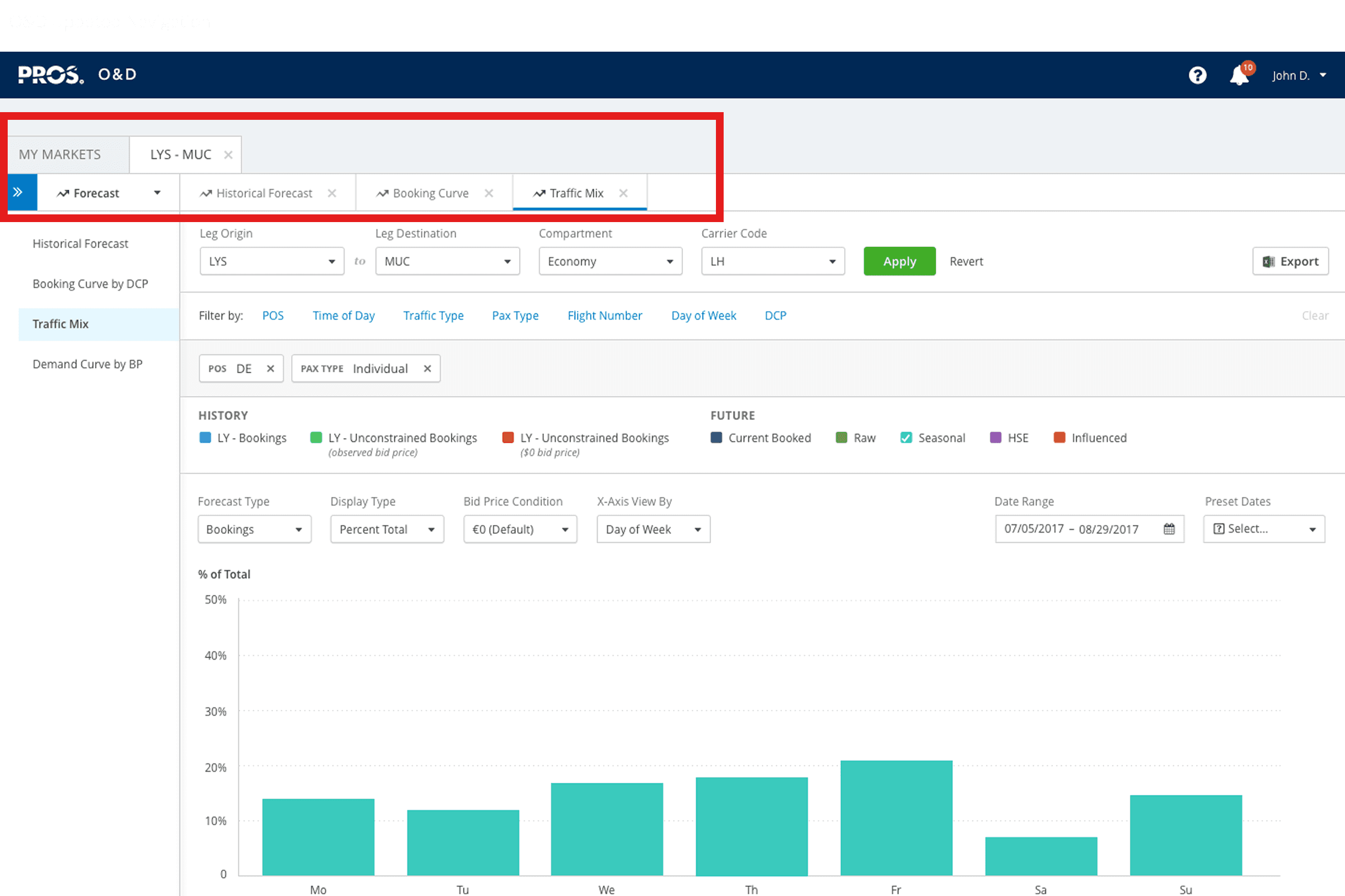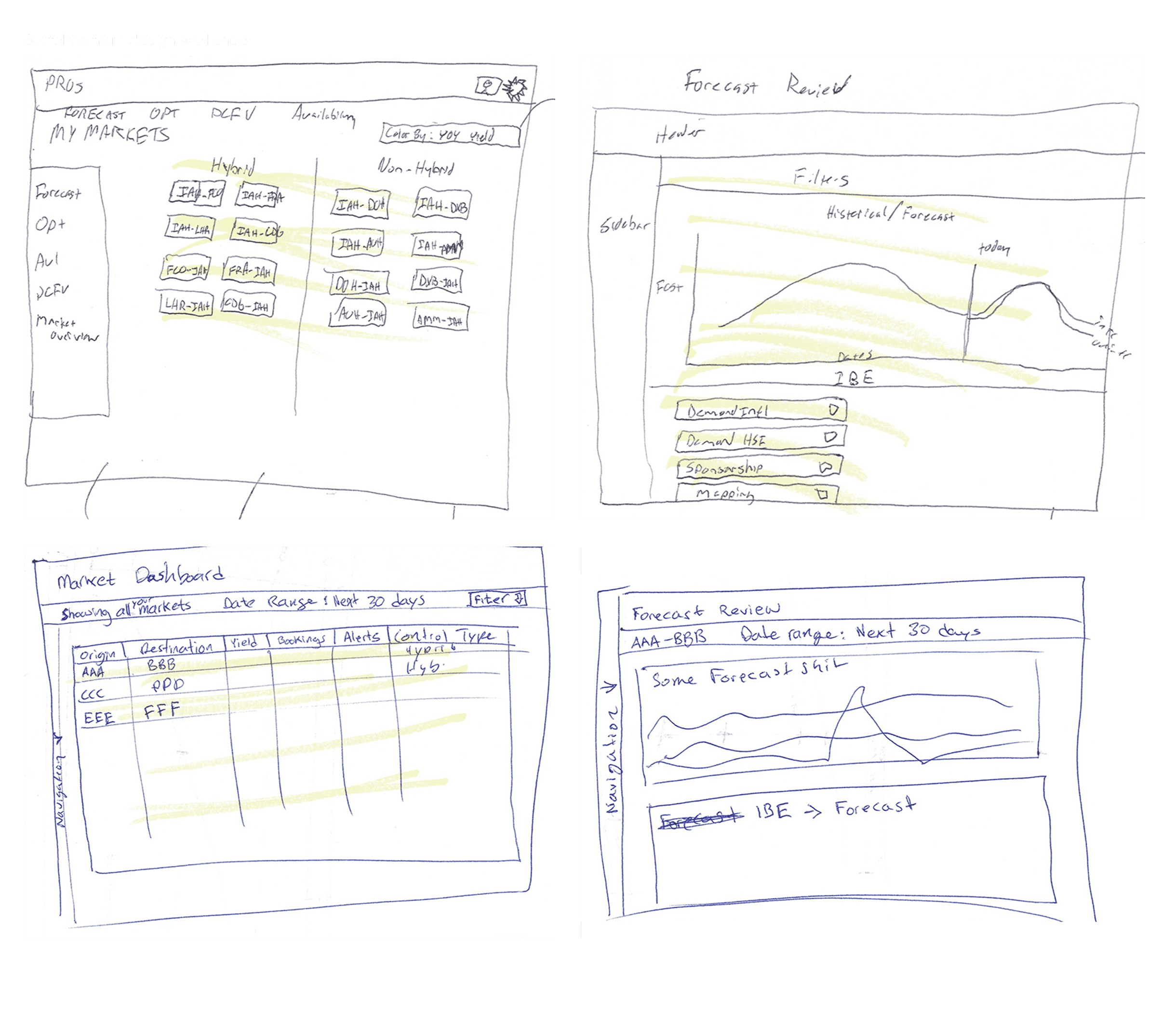 Since users all thought and communicated that markets (Houston to Miami) is the most important object to traverse the O&D data. I came up with the idea of organizing the navigation by markets. The problem is it needed to be dynamic because users are assigned specific markets. I created a two level dynamic tab navigation that provides context of what you viewed in the past while focusing the user on what matters the most, their markets.